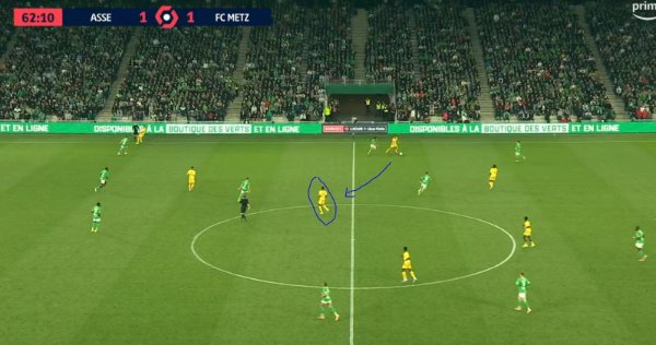 Il y a un exemple flagrant à 62ème. Il était le seul en position de recevoir le ballon, mais comme il n'en voulait pas au départ, il n'a pas attaqué le ballon et s'est fait prendre par le Stépanois, 10s plus tard l'action se termine par un tir dangereux dévié de la tête par Sane. Une vidéo aurait été plus parlante, mais on fait comme on peut