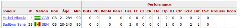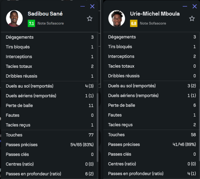 Également, Sané gagne aux tacles réussis et aux fautes commises, Mboula gagne aux interceptions et fautes provoquées.