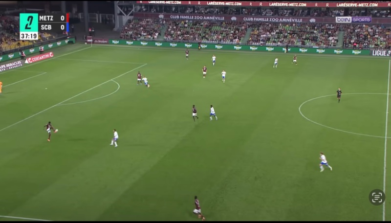 La passe de HEIN n'est pas banale. Elle est longue et haute, ce qui laisse le temps aux bastiais de presser le gars qui va la réceptionner. Et en plus, elle va en retrait sur le dernier défenseur messin qui manque de réussite sur son contrôle, puisque le ballon amorti, rebondit sur son pied d'appui et s'éloigne de lui.
