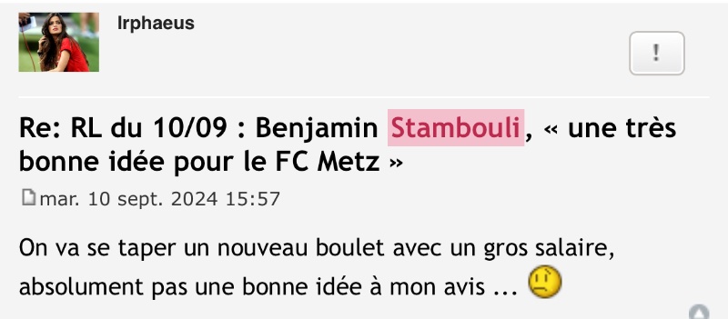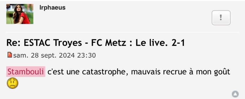 Je crois qu'à ce stade, il ne reste plus qu'à quitter le forumNico a écrit :J’ai rien contre toi, mais tu y est allé très fort avec Stambouli. Tu as quand même dis que c’était devenu une loque, que c’était un nouveau boulet avec un gros salaire, qu’il était cramé et allait faire banquette dans peu de temps, que c’était une mauvaise recrue…Irphaeus a écrit :