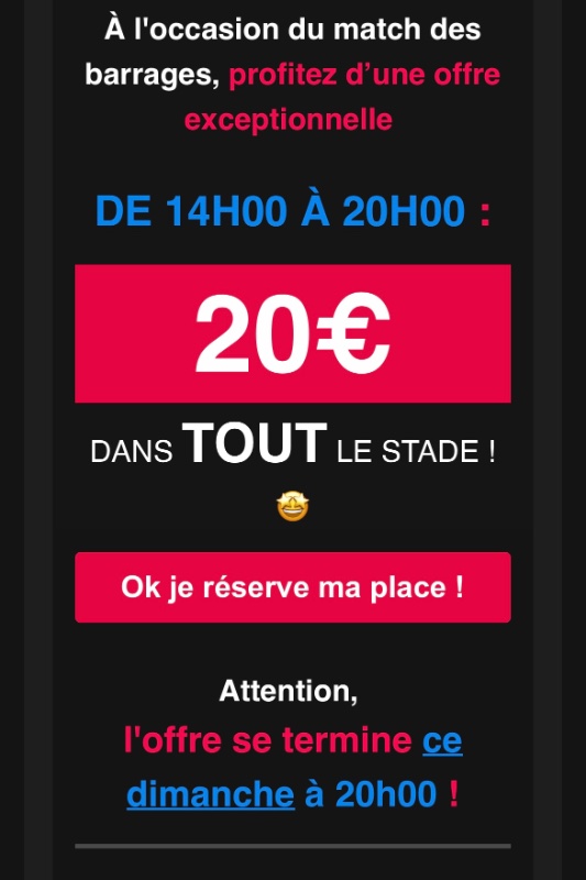 Merci pour l'info, mes places sont prises. Soit ils n'ont pas tout ouvert, soit le stade sera vraiment pleinGrenat 1985 a écrit : L’offre s’ouvre à tous à partir de 14 heures :