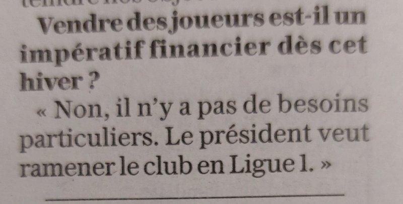 Celle de quitter la Ligue 2 dans un délai plus ou moins rapide. Ce qui, à mon sens, est une fausse bonne idée.alain0157 a écrit :Et quelle est la promesse en question ?Deki a écrit : Je rappelle que les promesses n’engagent que ceux qui y croient.