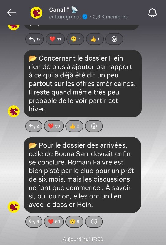 Culture Grenat dit que Sarr va signer et le coach temporiseRdNetwork a écrit : Le Mignan en conférence cet après-midi : "Il ne s'est pas entraîné avec nous cette semaine mais il va reprendre lundi. [...] La discussion entre lui, moi, et le club a été assez claire : à son poste, aujourd'hui, il y a déjà du monde donc c'est compliqué de l'intégrer malgré son passif, parce qu'on a un effectif en place et on ne peut pas empiler 4 joueurs pour le même poste, donc pour l'instant ça reste là où ça en est"