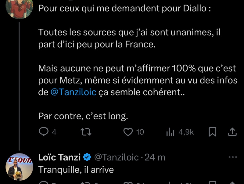 Si le club de Diallo attend une offre de dernière minute avant de le laisser partir à Metz, peut être qu'un ou deux attaquants attendent le feu vert de Metz pour signer si Diallo ne vient pas.Kiara40 a écrit :Oui pour qu'on ne reste pas le bec dans l'eau lundi a 20 h et qu'on se retrouve avec un attaquant de 16 ans et un autre de 18 ans....Lutin57. a écrit :