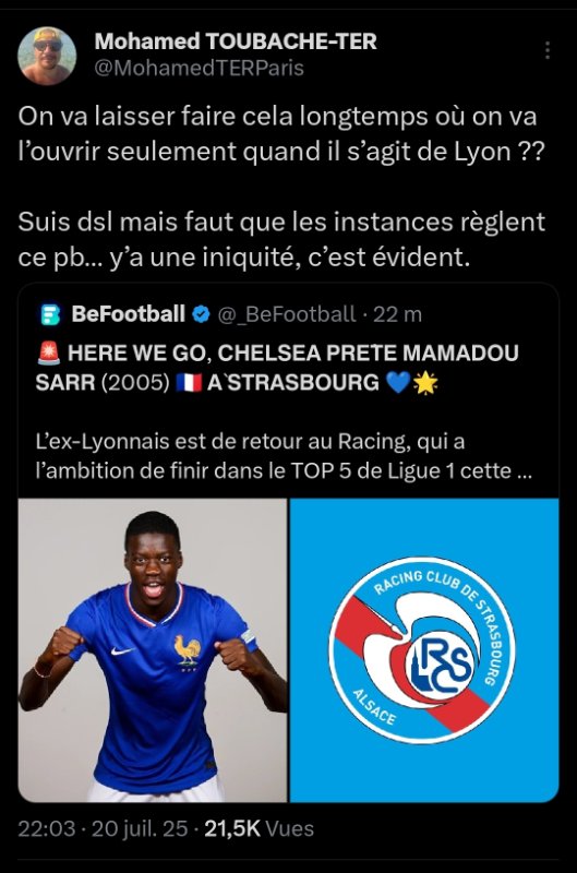 C’est différent car Chelsea et Strasbourg ont le même propriétaire.Vixxens a écrit : On a vendu Sarr à Tottenham qui nous l'a prêté, je vois pas le pb.