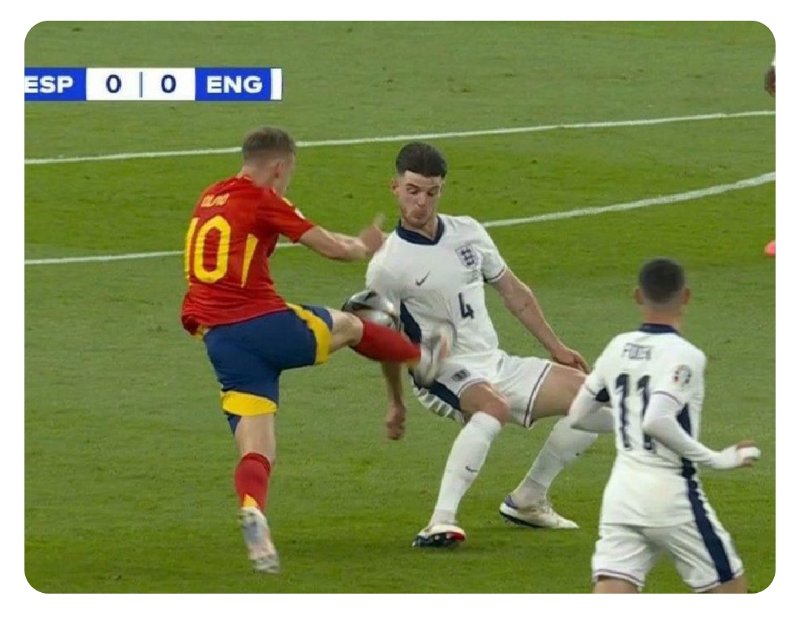 Et bien figure toi qu'une action me reste en travers de la gorge lors de la finale du dernier euro : un certain Dani Olmo qui vient s'empaler violemment à la 30ème minute avec son crampon à hauteur du bas ventre de Declan Rice. Faute sanctionnée d'un carton jaune.