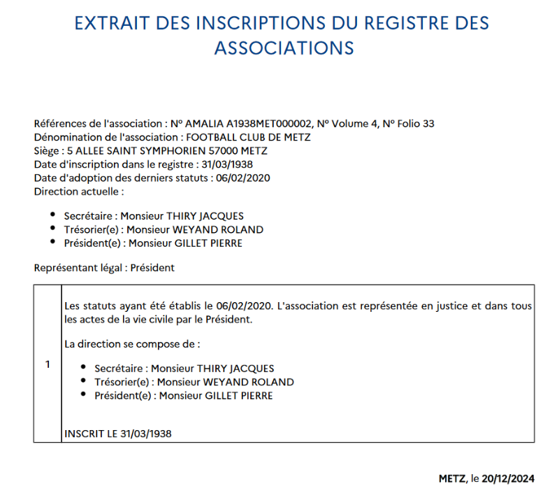 De plus, le but de ce sujet était de prouver une création de 1932 par la recherche des dépôts des statuts du FC Metz mais ceux actuels datant de 1938, il nous est expliqué que ces statuts n'ont au final pas d'importance.