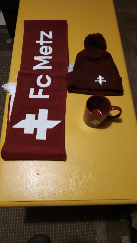 (on voit bien la différence de "grenat " entre l écharpe et le bonnet pas top pour un ensemble FC Metz "officiel"