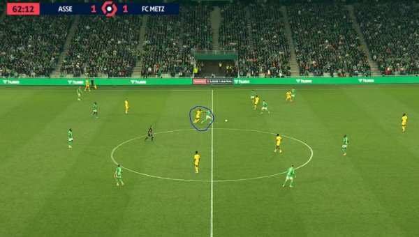 Il y a un exemple flagrant à 62ème. Il était le seul en position de recevoir le ballon, mais comme il n'en voulait pas au départ, il n'a pas attaqué le ballon et s'est fait prendre par le Stépanois, 10s plus tard l'action se termine par un tir dangereux dévié de la tête par Sane. Une vidéo aurait été plus parlante, mais on fait comme on peut
