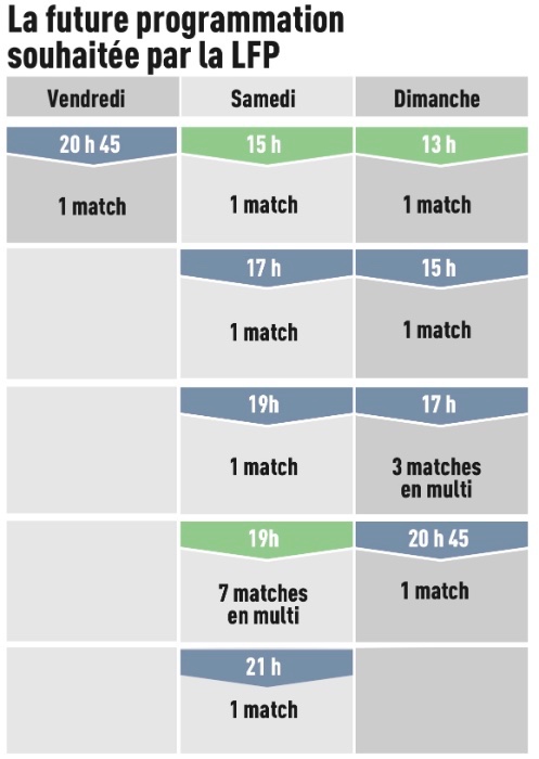 Côté pratique, la programmation de ses affiches (la meilleure et le second choix une semaine sur deux) ne sera a priori pas affiliée à des cases fixes, mais pourrait bouger, si besoin, au sein du week-end type présenté lors de l’appel d’offres infructueux de la LFP, à l’automne dernier. Il débutait le vendredi soir (20 h 45) pour se clôturer le dimanche (15 heures, 17 heures, 20 h 45), avec également trois cases le samedi (17 heures, 19 heures, 21 heures).