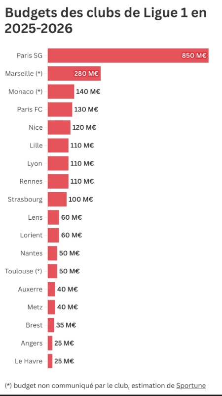 Confirmation qu'on est bien dans un championnat à 2 vitesses derrière l'intouchable QSG : Les >100M€ qui jouent l'Europe et les <60M€ qui jouent le maintien (sauf Lens et Brest s'ils retrouvent leur dynamique des deux dernières années).Grenat 1985 a écrit : Les budgets selon L’Équipe :