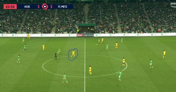 Il y a un exemple flagrant à 62ème. Il était le seul en position de recevoir le ballon, mais comme il n'en voulait pas au départ, il n'a pas attaqué le ballon et s'est fait prendre par le Stépanois, 10s plus tard l'action se termine par un tir dangereux dévié de la tête par Sane. Une vidéo aurait été plus parlante, mais on fait comme on peut