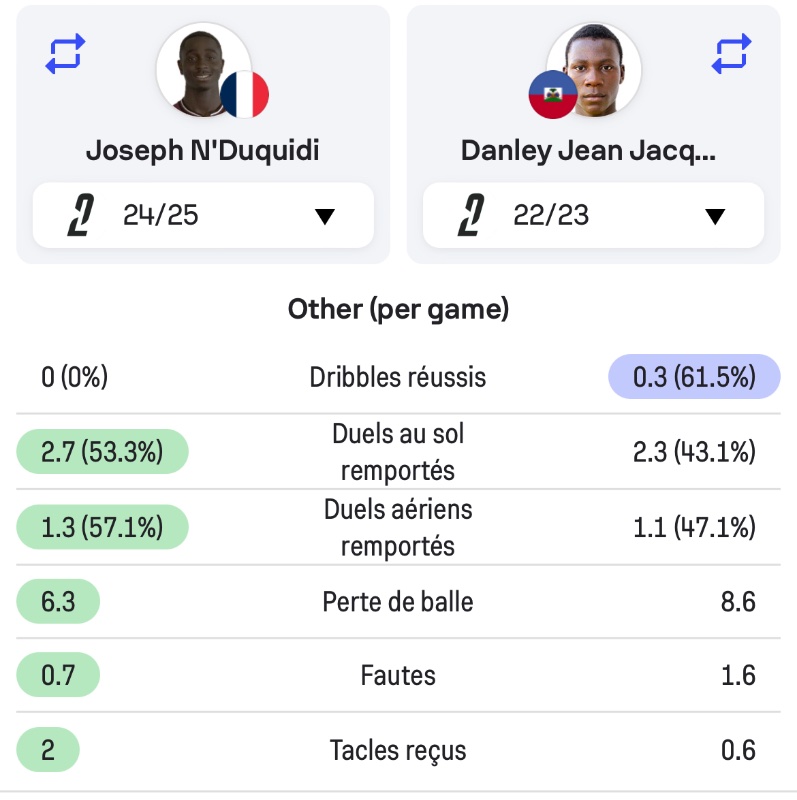 Et juste pour terminer la comparaison avec Danley, quelques stats sur Danley en L2 avec nous il y a 2 ans VS Nduquidi avec nous en L2 cette année (assez peu révélant car pas beaucoup de match mais quand même):