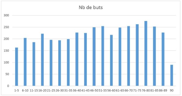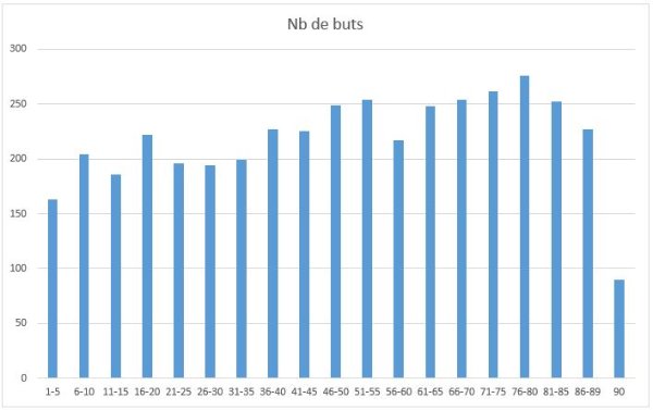 J'ai regardé manuellement sur les 10 dernières saisons et il y a bien une tendance à ce que le dernier quart d'heure donne plus de buts, mais la différence reste assez faible. Je suppose que la confusion vient du fait qu'on ajoute en général les arrêts de jeu comme tu l'as souligné.