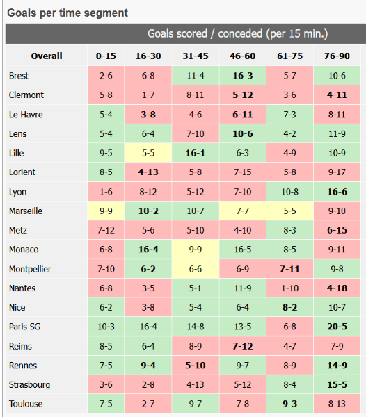 Mais au-delà ça c'est assez net, avec les débuts de match, que c'est notre pire phase de match. Certes moins que Nantes qui vraiment craque complètement dans ses fins de match et quasi-exclusivement là-dedans, mais le problème est là pour Metz, là c'est plus équilibré pour beaucoup d'autres équipes
