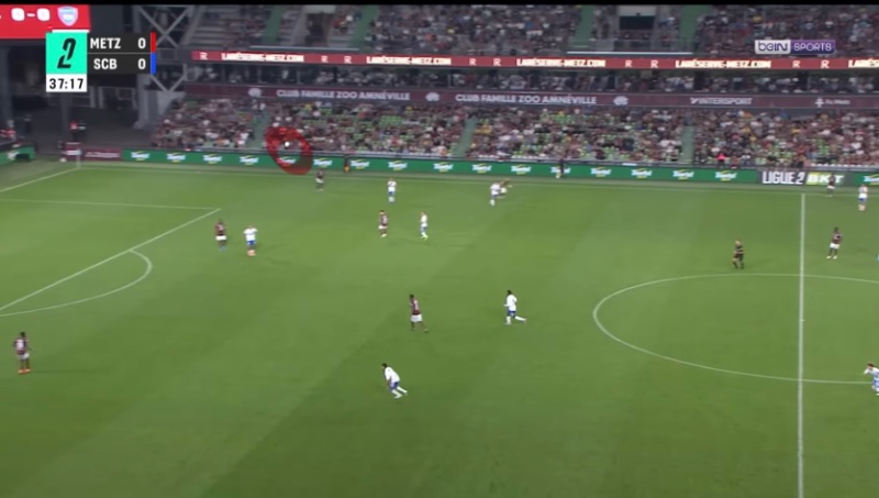 La passe de HEIN n'est pas banale. Elle est longue et haute, ce qui laisse le temps aux bastiais de presser le gars qui va la réceptionner. Et en plus, elle va en retrait sur le dernier défenseur messin qui manque de réussite sur son contrôle, puisque le ballon amorti, rebondit sur son pied d'appui et s'éloigne de lui.