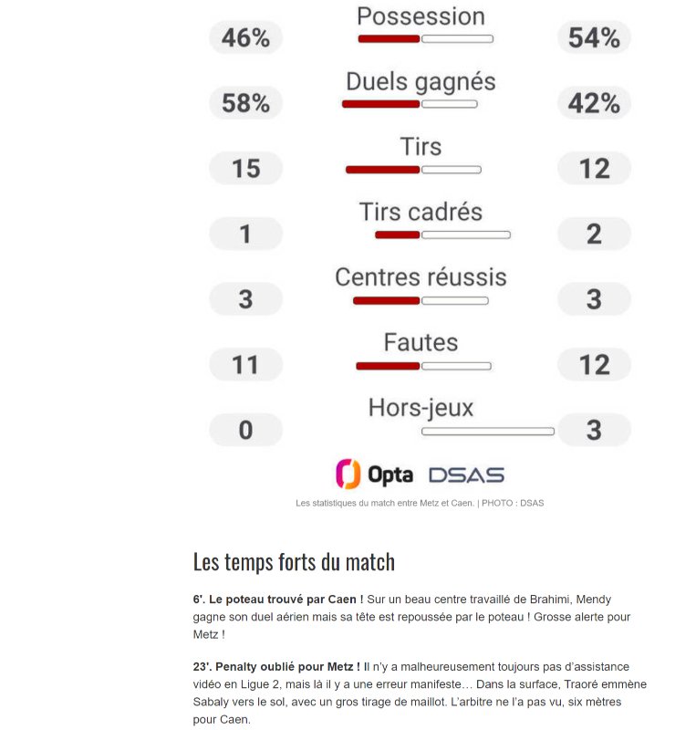 Pour confirmer les impressions messines, celles de Ouest France , avec les stats FCM à gauche SM Caen à droite et les commentaires concernant la 23éme minute :
