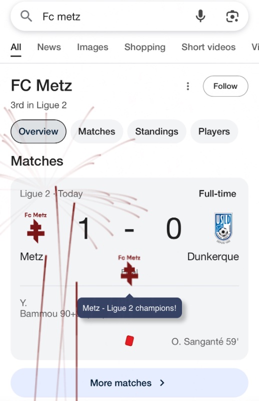 Le +: Google qui marque le FC Metz comme champions de Ligue 2 avec un joli feu d’artifice grenat, car ils ont compris que les vrais patrons, ce sont les grenats!