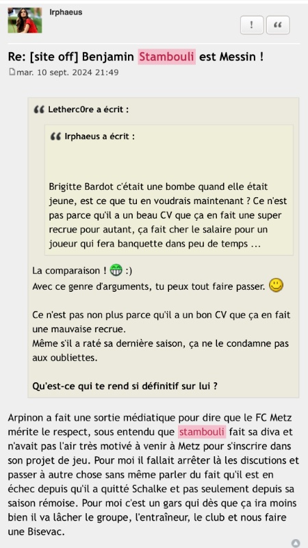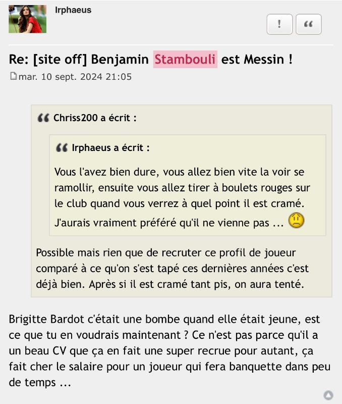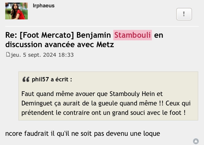 Je crois qu'à ce stade, il ne reste plus qu'à quitter le forumNico a écrit :J’ai rien contre toi, mais tu y est allé très fort avec Stambouli. Tu as quand même dis que c’était devenu une loque, que c’était un nouveau boulet avec un gros salaire, qu’il était cramé et allait faire banquette dans peu de temps, que c’était une mauvaise recrue…Irphaeus a écrit :