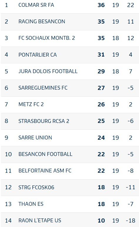 A noter la très belle phase retour de Sarreguemines qui traînait en queue de tableau à Noël et a pris un peu de distance avec les relégables.