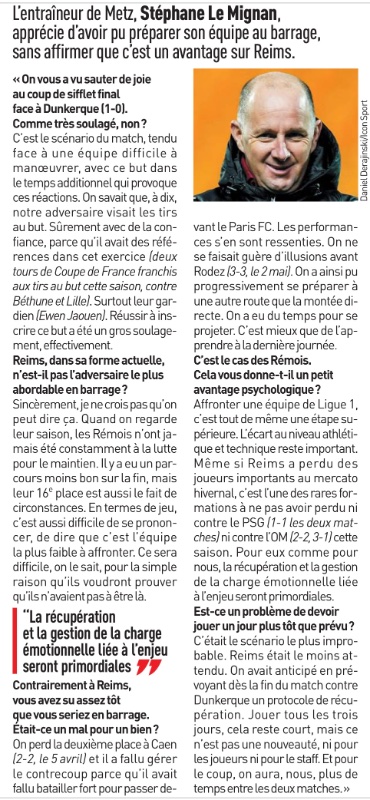 On a nos chances car Reims c'est moins bon que Le Havre et Saint Etienne. Si on ne passe pas contre ce Reims on mérite pas de monter. Et on verra si Le Mignan a un minimum de culture tactique car la 2ème place on l'a donné au PFC et il a une grosse responsabilité la dedans. Ne pas battre le Red star , Rodez et Caen c'est une faute professionnelle pour une équipe qui prétend jouer la montée.
