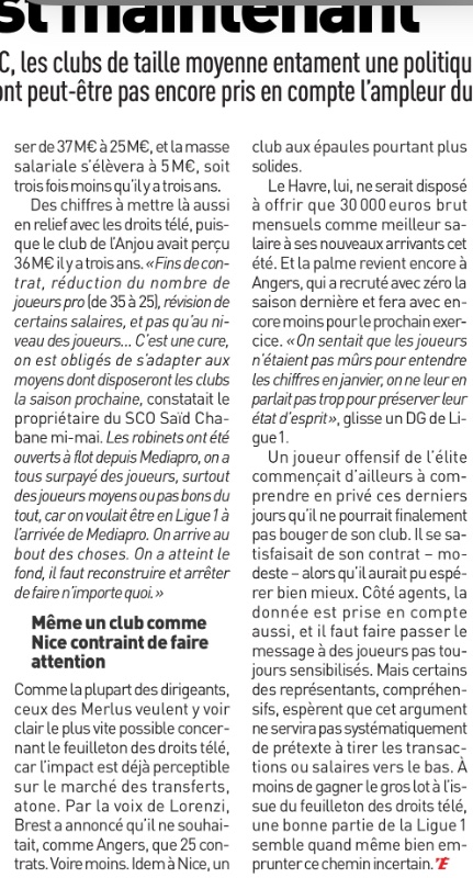 Cet article va remettre en perspective certaines prétentions. Le Havre propose 30000€/mois max, Angers veut réduire le nombre de contrats à 24, etc... L'austérité est la. Les joueurs vont devoir faire avec.