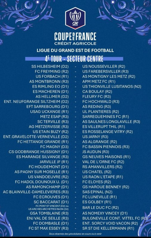 belle affiche pour eux... Mais je pense qu'ils vont devoir délocaliser le match.. Je m'avance peut être mais je ne connais pas leurs structuresAventurix a écrit : Un petit club du Pays de Bitche face à l'ogre thionvillois : allez Rimling !!!![]()