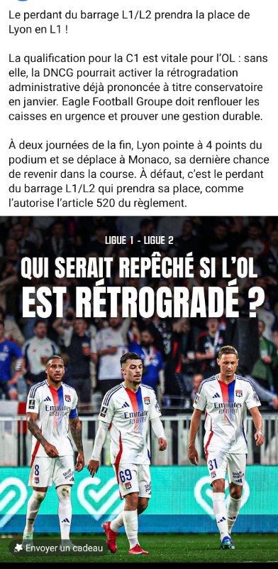 Non, l'article 520 du réglement des compétitions prévoit le repechage du perdant des barrages......Frayel a écrit :Non ce serait soit le havre si défaite en barrage soit les verts ...Backpacker a écrit : Apparement, c'est quasi acquis que sans ligue des champions, Lyon repartira en ligue 2 l an prochain.