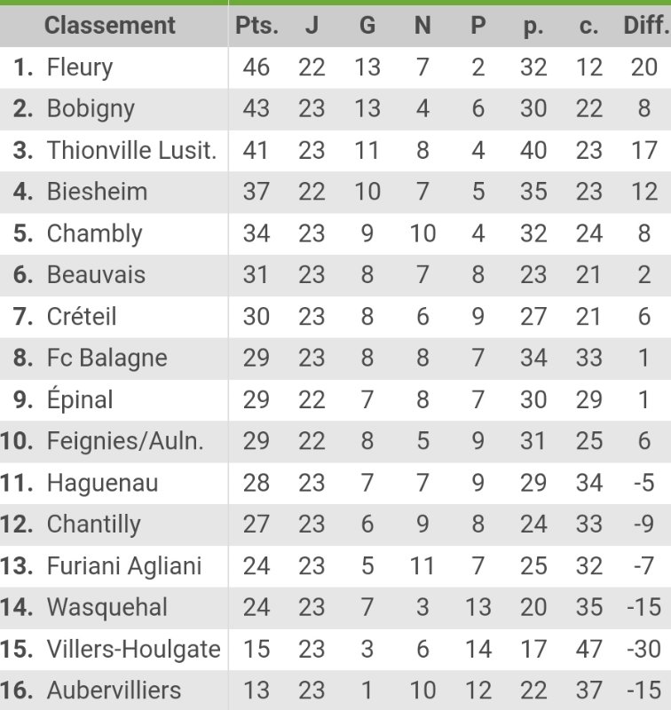 Au classement, à 7 journées de la fin : Fleury devance désormais le second de 6 pts, et Thionville (3e) de 8 points.