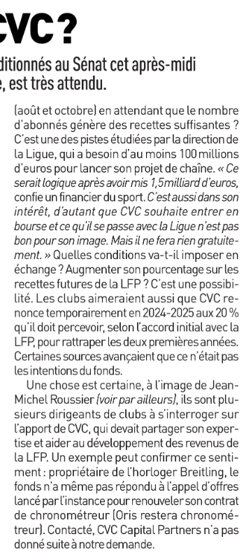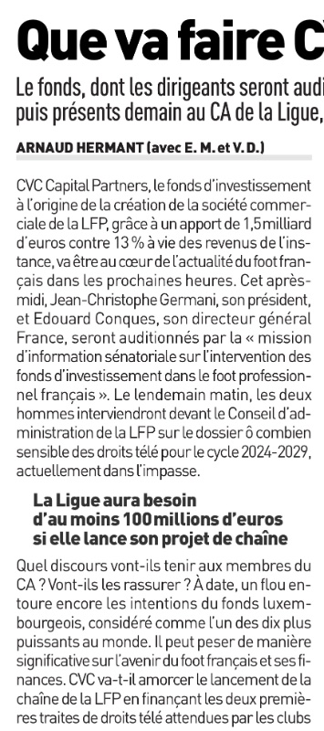 Je garde l'espoir que la LFP présente un projet avec une issue heureuse. C'est-à-dire un montant a minima équivalent à celui de cette saison après le remboursement de CVC (20 % sur les recettes de la LFP en 2024-2025). C'est un souhait modeste. À la vue des derniers éléments, il faut espérer un miracle. Depuis des mois, une équipe, censée avancer avec des spécialistes mondiaux, est au travail. C'est malheureux d'attendre une intervention divine pour obtenir 400 ou 500 M € comme je le lis. On a créé une société commerciale, qui prend 13 % des recettes à vie de la Ligue, pour en arriver là ?