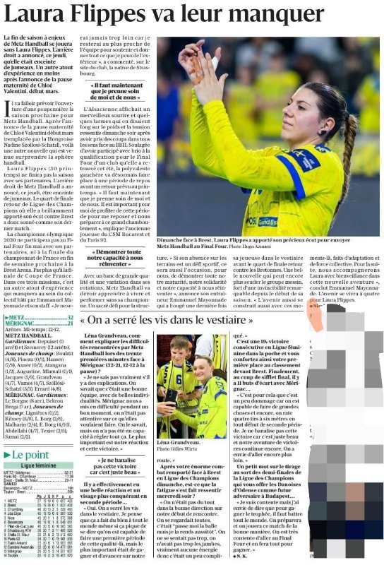 Aprés Chloe Valentini, au tour de Laura Flippes......2 absences préjudiciables en cette fin de saison.