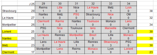 J'ai fait la même chose en étant un peu + optimiste et j'ai trouvé Clermont distancé à 23 pts et Metz, Lorient Nantes à 30 pts (mais c'et optimiste)Ettorre a écrit : Jouer pour ne pas perdre devrait nous conduire à la relégation.