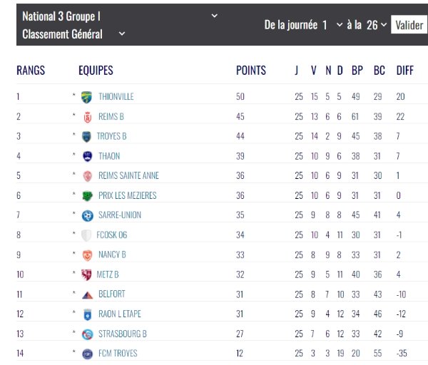 Non, 8éme au classement, 2 points d'avance sur les 11 et 12 eme, la fff a penalisé de 3 points Mezieres et nancy._Chris. a écrit :Beaucoup de nuls pour nos concurrents directs … on redescend soit premier relegable soit premier non relegable. Je n’ai pas le détail du goal average particulierSam 89 a écrit : Défaite 2-1 à Belfort. Tout se jouera avec la réception de Reims Sainte Anne la semaine prochaine. Victoire obligatoire !