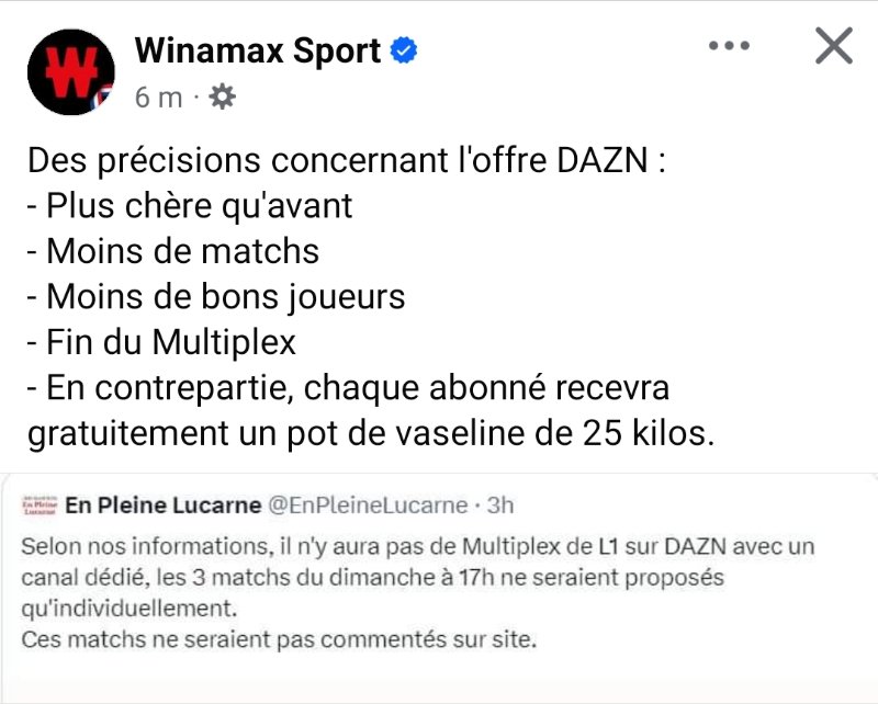 Dans L’Équipe du jour.Carrass' a écrit :Ah ben si c'est le cas au final ça m'arrangerait plus que le samedi 19hGrenat 1985 a écrit : Plus précisément, BeIn voudrait que les matchs aient lieu le vendredi soir à 20h45 ou 21h.![]()