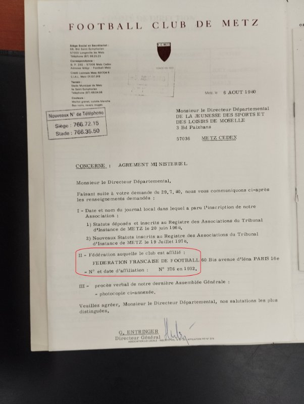 Non, car c'est la FFF qui donne les numéros. Depuis 1947, celui du FC Metz est le n°154 qui correspond à une date d'affiliation de 1919. En 1932, celui du FC Metz était le n°376, qui correspond à une date d'affiliation de 1919.pilch a écrit :Est-ce que tu as pensé à contacter la LFP (ou l'association qui justement donne des numéro d'affiliation) ?DCD a écrit : Le numéro 376 a été attribué en 1919 au CA Messin.