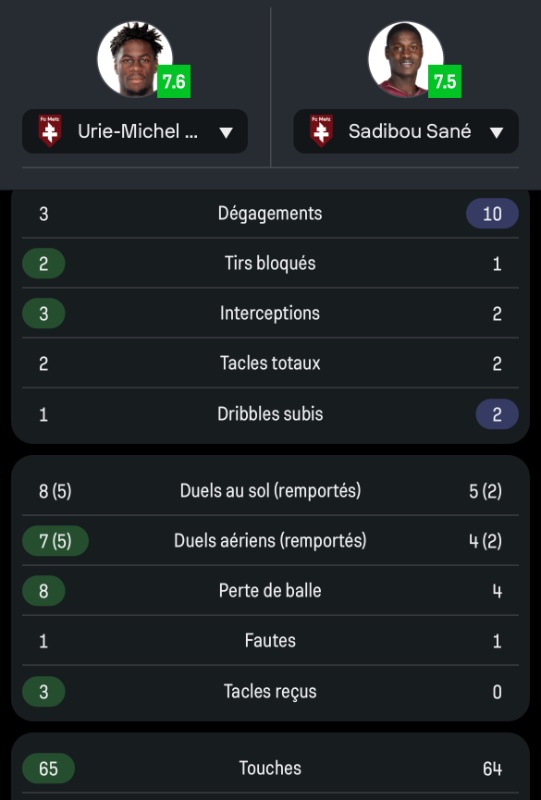 C’est marrant, je suis allé voir les stats sur Sofascore car moi aussi je trouve que Sané a fait un bien meilleur match que Mboula que j’ai trouvé peu rassurant (j’ai noté Sané 8 et Mboula 6). Voici leur stats respectives et on peut noter qu’en dehors des pertes de balles, Mboula a des meilleurs stats à tous les niveaux…DidierZedong a écrit :Clairement. Sans Sané on perd le match .vag'à bond a écrit : Heureusement que Sane ou Udol étaient en 2e rideau pour rattraper ses erreurs de placement et ses approximations