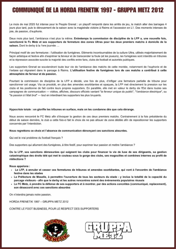 Communiqué sorti ce jour par les deux groupes UltrasGégé55 a écrit :Moi je suis resté sur ça, donc j'en déduis que les groupes vont être ailleurs dans le stade (est ce qu'il y a eu un changement depuis ?)Soren a écrit :